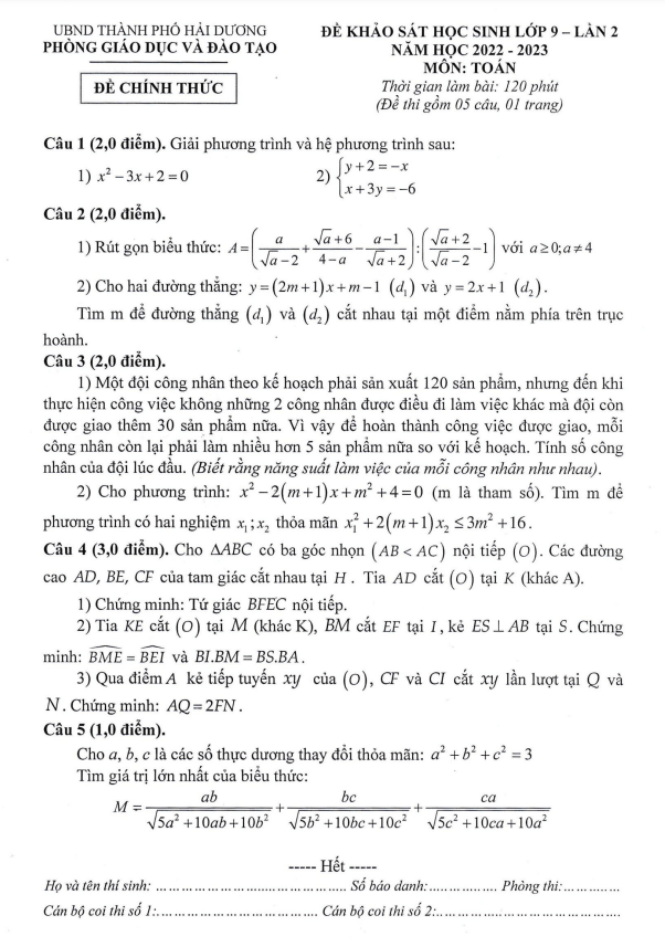 Đề khảo sát Toán lớp 9 lần 2 năm 2022 – 2023 phòng GD&ĐT thành phố Hải Dương