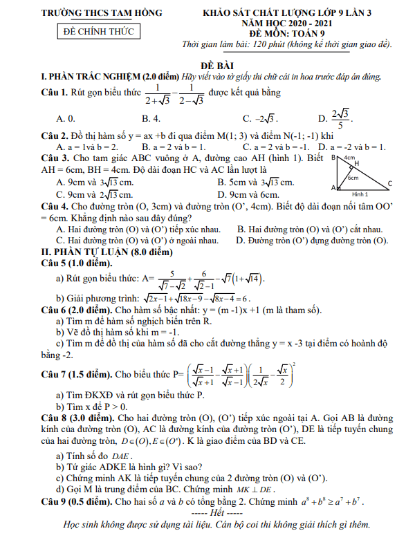 Đề khảo sát Toán lớp 9 lần 3 năm 2020 – 2021 trường THCS Tam Hồng Vĩnh Phúc mang đến cho học sinh những thách thức và bài toán đa dạng, giúp họ rèn luyện kỹ năng giải quyết vấn đề, logic và sự tự tin trong môn Toán.