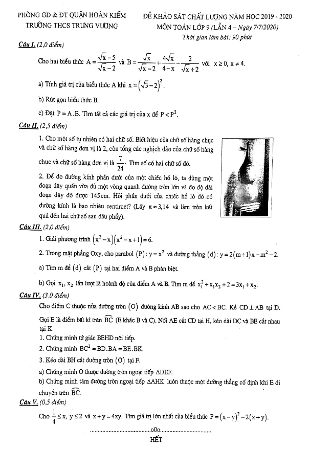 Đề khảo sát lớp 9 môn Toán lần 4 năm 2019-2020 tại trường THCS Trưng Vương Hà Nội
