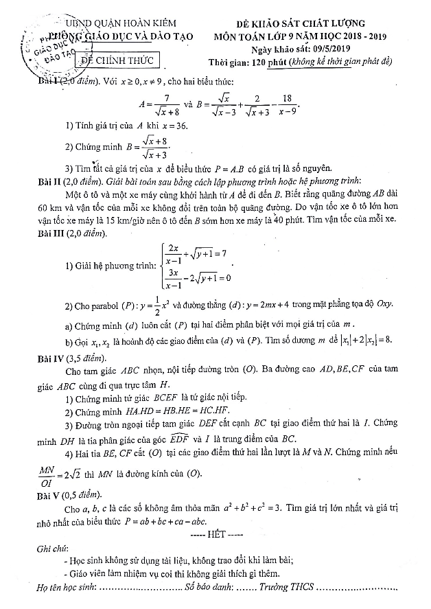Ngày 09/05/2019, Phòng Giáo dục và Đào tạo quận Hoàn Kiếm, Hà Nội đã tổ chức kỳ thi khảo sát chất lượng môn Toán lớp 9 năm học 2018 – 2019. Kỳ thi này nhằm mục đích đánh giá năng lực học tập của học sinh trước khi họ bước vào kỳ thi tuyển sinh vào lớp 10 THPT năm học 2019 – 2020.