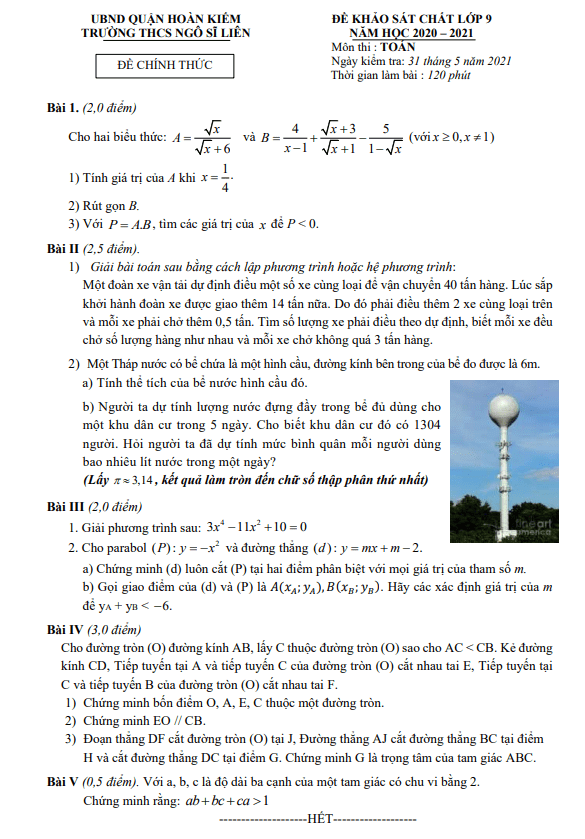 Ngày 31 tháng 05 năm 2021, trường THCS Ngô Sĩ Liên, quận Hoàn Kiếm, thành phố Hà Nội đã tổ chức kỳ thi khảo sát chất lượng (KSCL) môn Toán lớp 9 năm học 2020-2021. Đề thi này nhằm giúp các em học sinh lớp 9 rèn luyện kỹ năng và chuẩn bị cho kỳ thi tuyển sinh vào lớp 10 môn Toán năm học 2021-2022 do sở Giáo dục và Đào tạo thành phố Hà Nội tổ chức.