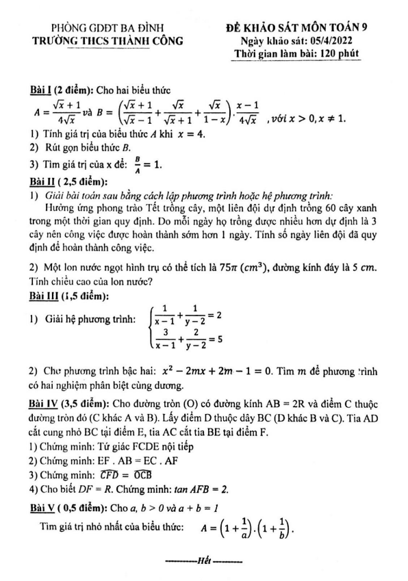 Trích dẫn đề khảo sát môn Toán lớp 9 năm 2021 – 2022 trường THCS Thành Công – Hà Nội: