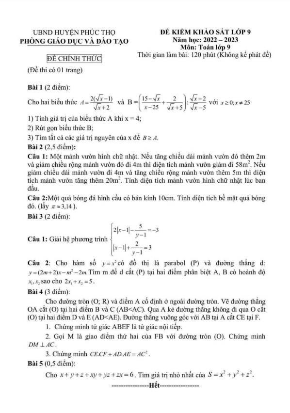 Đề khảo sát môn Toán lớp 9 năm 2022-2023 phòng GD&ĐT Phúc Thọ Hà Nội