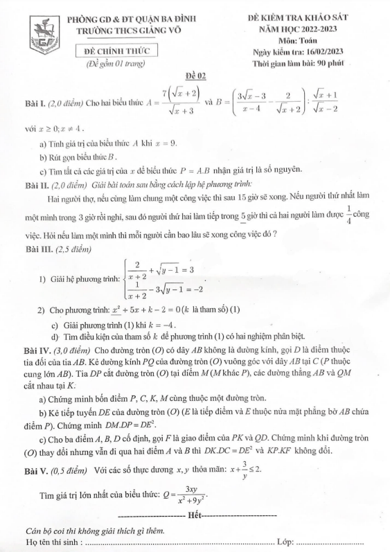 Xin chào quý thầy cô và các em học sinh lớp 9! Hôm nay, Sytu xin giới thiệu đến các bạn đề kiểm tra khảo sát chất lượng môn Toán lớp 9 năm học 2022 – 2023 của trường THCS Giảng Võ, quận Ba Đình, thành phố Hà Nội. Kỳ thi sẽ được tổ chức vào ngày 16 tháng 02 năm 2023, với đề thi bao gồm đáp án và lời giải chi tiết (được thực hiện bởi CLB Toán Thực Chiến).