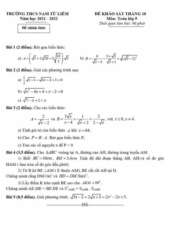 Đề khảo sát Toán lớp 9 tháng 10 năm học 2021 – 2022 trường THCS Nam Từ Liêm – Hà Nội
