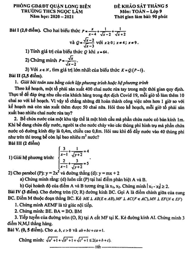 Đề khảo sát Toán lớp 9 tháng 5 năm 2021 trường THCS Ngọc Lâm – Hà Nội