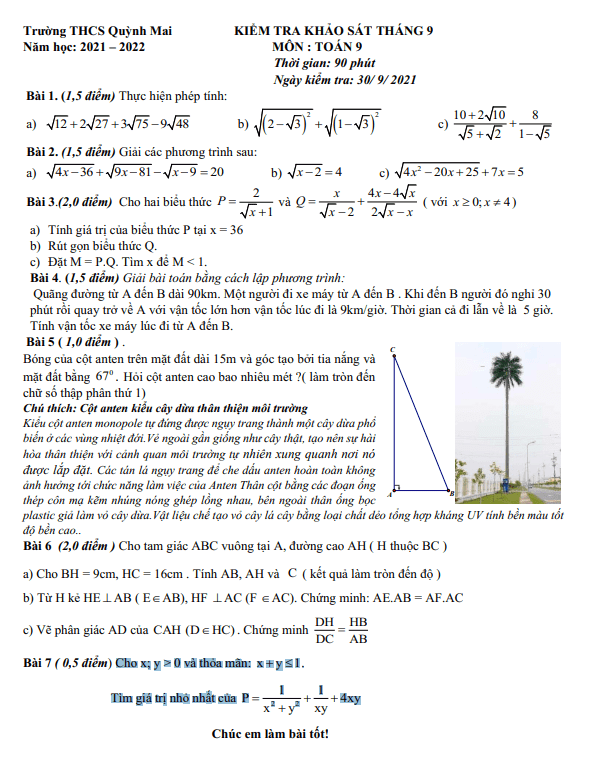 Đề khảo sát Toán lớp 9 tháng 9 năm 2021 trường THCS Quỳnh Mai Hà Nội