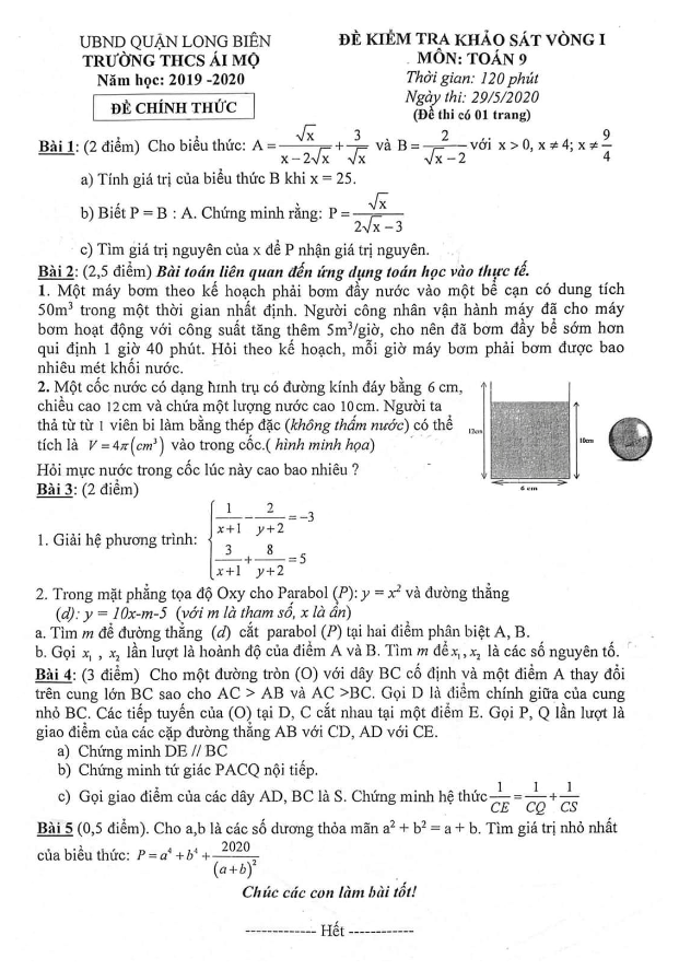 Vào Thứ Sáu, ngày 29 tháng 05 năm 2020, trường THCS Ái Mộ tại quận Long Biên, thành phố Hà Nội đã tổ chức kỳ thi kiểm tra khảo sát chất lượng môn Toán cho học sinh lớp 9 vòng 1 năm học 2019-2020. Đề khảo sát này bao gồm 01 trang đề với 05 bài toán, thời gian làm bài 90 phút.