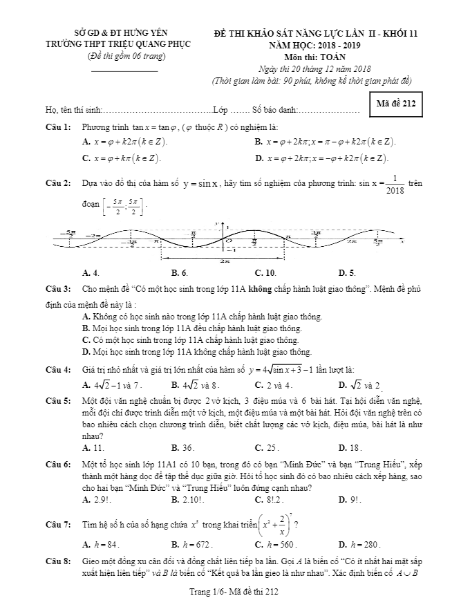 Đề khảo sát năng lực môn Toán lớp 11 năm học 2018 – 2019 tại trường Triệu Quang Phục Hưng Yên lần 2 có mã đề 212 được biên soạn nhằm đánh giá chất lượng Toán thường xuyên và giúp học sinh củng cố, nâng cao kiến thức và kỹ năng giải toán. Đề bao gồm 50 câu hỏi và bài toán trắc nghiệm khách quan trên 6 trang, học sinh có 90 phút để hoàn thành bài thi. Kỳ thi đã diễn ra vào ngày 20 tháng 12 năm 2018.