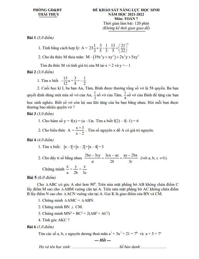 Đề khảo sát năng lực lớp 7 môn Toán năm 2021-2022 phòng GD ĐT Thái Thụy Thái Bình