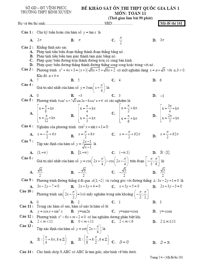 Đề khảo sát ôn thi THPT Quốc gia lần 1 môn Toán lớp 11 trường THPT Bình Xuyên – Vĩnh Phúc là bài kiểm tra quan trọng giúp học sinh chuẩn bị tốt cho kì thi quan trọng sắp tới. Đề thi bao gồm 50 câu hỏi trắc nghiệm, có thời gian làm bài là 90 phút và có đáp án giúp học sinh tự kiểm tra kết quả sau khi hoàn thành.