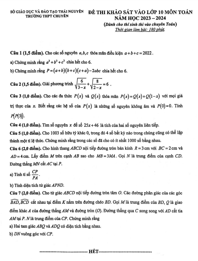 Đề thi chuyên Toán vào lớp 10 THPT chuyên Thái Nguyên năm 2023 – 2024