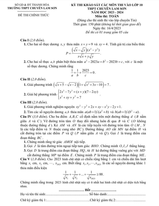 Xin chào quý thầy cô và các em học sinh lớp 9! Dưới đây là nội dung của đề thi khảo sát chất lượng môn Toán (Tin) dành cho việc ôn thi tuyển sinh vào lớp 10 THPT năm học 2023 – 2024 tại trường THPT chuyên Lam Sơn, Thanh Hóa. Đề thi này được thi sinh thi vào lớp 10 chuyên Tin học.