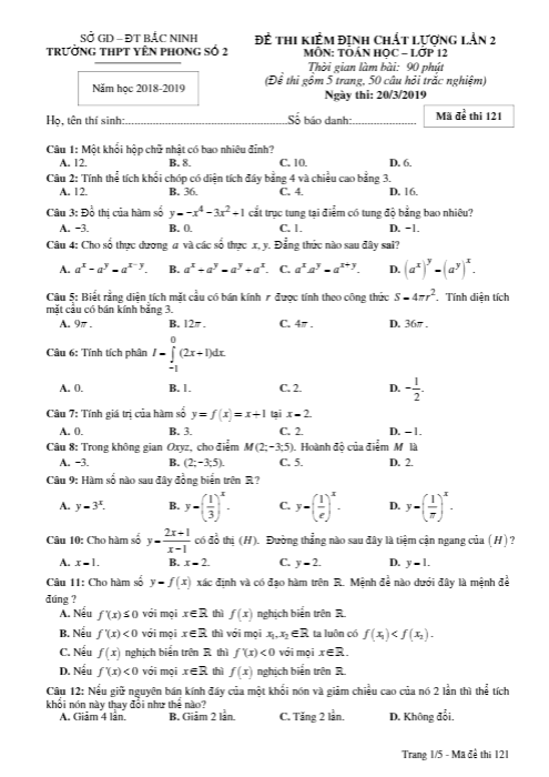 Đề kiểm định Toán lớp 12 lần 2 năm 2018-2019 của trường THPT Yên Phong 2 Bắc Ninh có mã đề 121, bao gồm 50 câu hỏi và bài toán trắc nghiệm khách quan trên 05 trang giấy. Học sinh có 90 phút để làm bài thi Toán, nội dung đề thi tập trung chủ yếu vào chương trình Toán lớp 12, cũng có một số bài toán về xác suất, dãy số từ chương trình Toán lớp 11 với đáp án đi kèm.