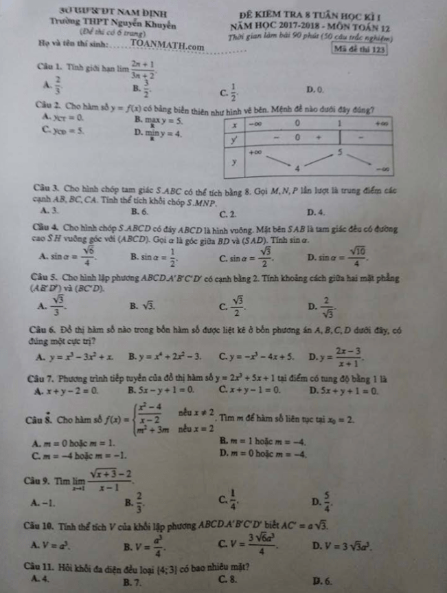 Đề kiểm tra 8 tuần HKI năm học 2017 – 2018 môn Toán lớp 12 trường THPT Nguyễn Khuyến – Nam Định
