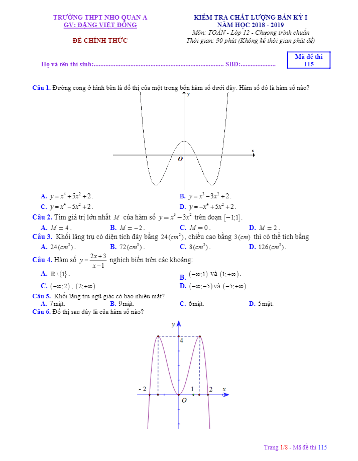 Đề kiểm tra chất lượng bán kỳ 1 môn Toán lớp 12 năm học 2018 – 2019 của trường THPT Nho Quan A – Ninh Bình có mã đề 115 đã được biên soạn theo hình thức trắc nghiệm khách quan với tổng cộng 50 câu hỏi. Đề bao gồm 7 trang, học sinh được thời gian làm bài trong vòng 90 phút. Nội dung của đề chỉ giới hạn trong phạm vi chương trình Toán lớp 12 đã học như hàm số và đồ thị, khối đa diện và thể tích khối đa diện, các bài toán thực tế có liên quan. Đề kiểm tra cung cấp đáp án cho học sinh.