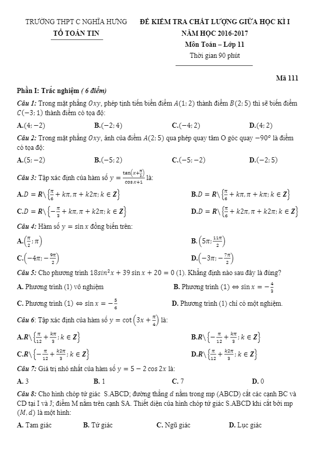 Đề kiểm tra chất lượng môn Toán lớp 11 trường C Nghĩa Hưng Nam Định