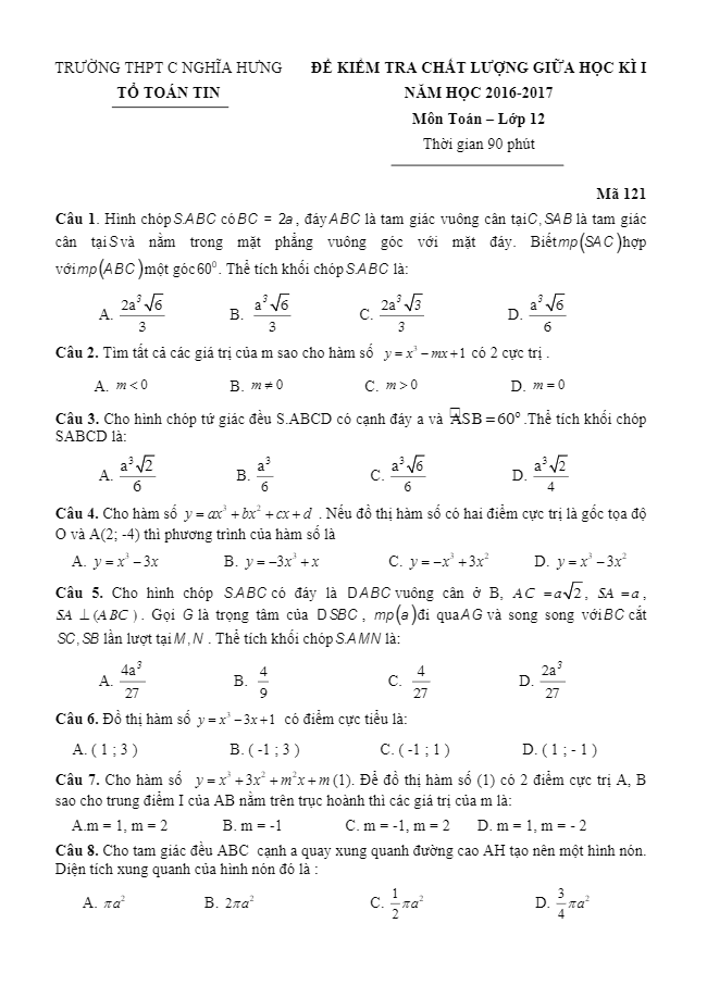 Đề kiểm tra chất lượng giữa HKI lớp 12 môn Toán trường C Nghĩa Hưng Nam Định