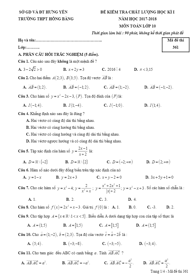Đề kiểm tra chất lượng Học kì 1 Toán lớp 10 năm học 2017-2018 của trường THPT Hồng Bàng – Hưng Yên bao gồm 20 câu hỏi trắc nghiệm và 3 bài toán tự luận. Thời gian làm bài được giao là 90 phút, đủ để học sinh có thời gian suy nghĩ và trả lời các câu hỏi đòi hỏi tư duy sâu.