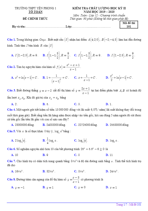 Trích dẫn một số nội dung trong đề kiểm tra học kỳ 2 Toán lớp 12 năm 2019-2020 trường THPT Yên Phong 1 – Bắc Ninh: