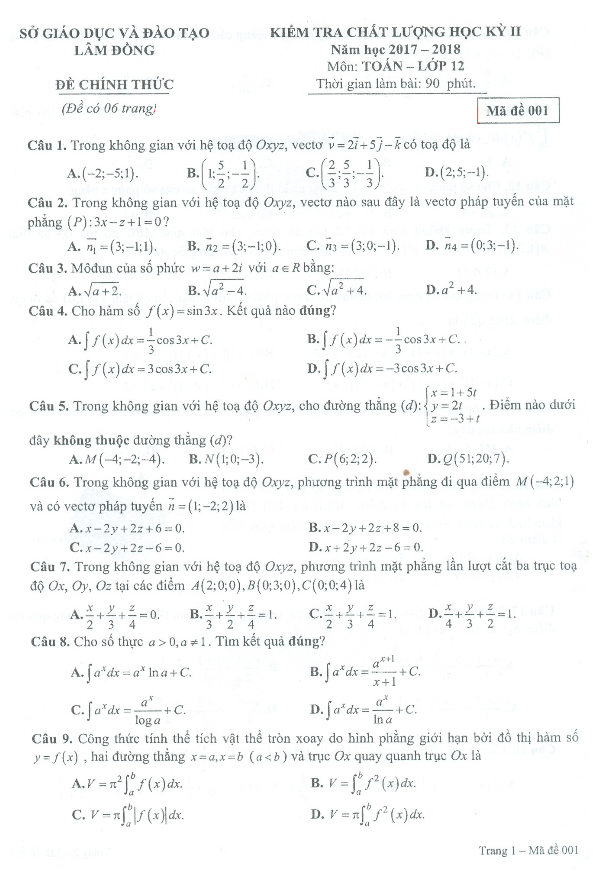 Đề thi chất lượng học kỳ 2 môn Toán lớp 12 năm học 2017-2018 do Sở Giáo dục và Đào tạo Lâm Đồng biên soạn mang mã đề 001. Đề thi bao gồm 6 trang với tổng cộng 50 câu hỏi trắc nghiệm khách quan. Thí sinh sẽ có thời gian làm bài trong khoảng 90 phút. Kỳ thi được tổ chức vào chiều ngày 26/04/2018 nhằm đánh giá chất lượng dạy và học môn Toán lớp 12 của giáo viên và học sinh khối 12 tại các trường THPT trên địa bàn tỉnh Lâm Đồng.