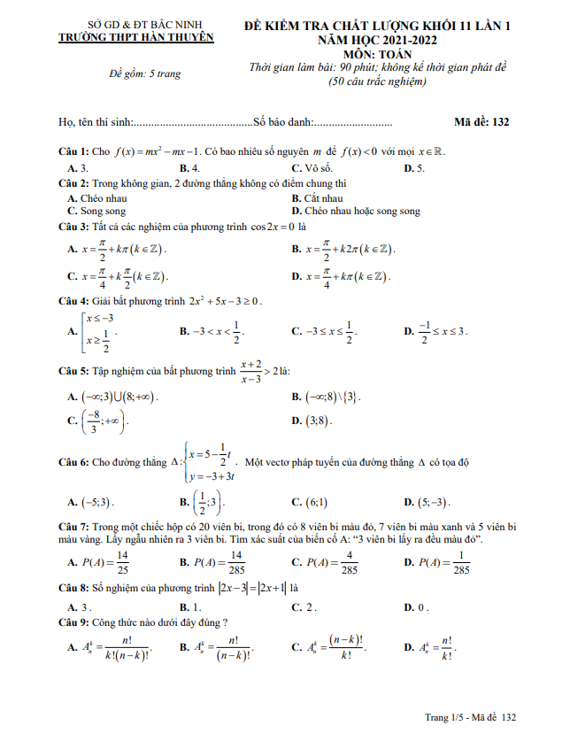 Xin chào quý thầy, cô và các em học sinh lớp 11! Sytu xin giới thiệu đến các bạn đề kiểm tra chất lượng môn Toán lớp 11 lần 1 năm học 2021 – 2022 của trường THPT Hàn Thuyên, tỉnh Bắc Ninh. Đề thi bao gồm các mã đề: Mã 132, Mã 209, Mã 357, Mã 485, Mã 570, Mã 628, Mã 743, Mã 896.