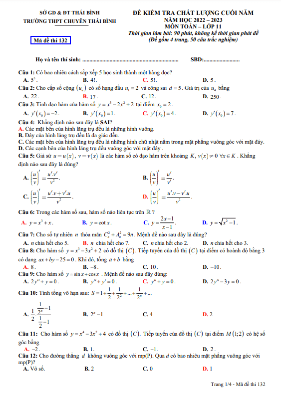 Xin chào quý thầy, cô giáo và các em học sinh lớp 11! Sytu xin giới thiệu đến các bạn đề kiểm tra chất lượng cuối năm môn Toán lớp 11 năm học 2022 – 2023 của trường THPT chuyên Thái Bình, tỉnh Thái Bình. Đề thi bao gồm các câu hỏi có đáp án mã đề 132 – 234 – 135 – 137.