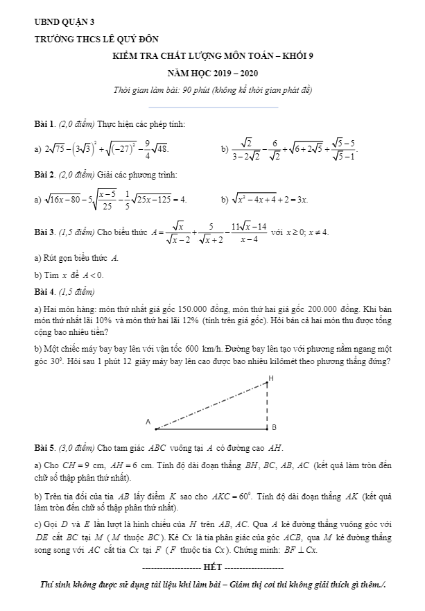 Kỳ thi kiểm tra chất lượng Toán lớp 9 năm 2019 – 2020 trường Lê Quý Đôn TP HCM