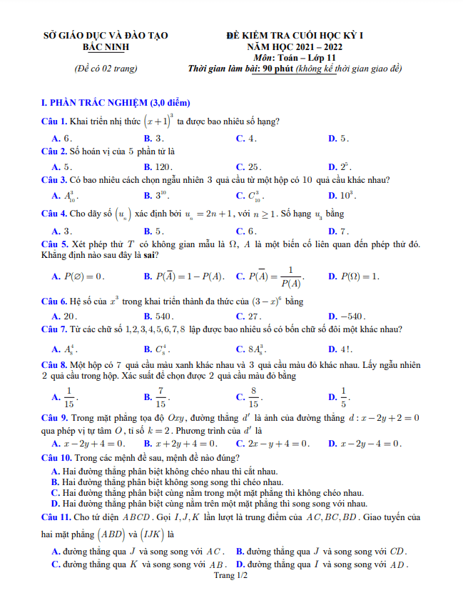 Đề kiểm tra cuối học kỳ 1 môn Toán lớp 11 năm 2021 – 2022 tại sở Giáo dục và Đào tạo Bắc Ninh đã được tổ chức vào ngày Thứ Năm 06 tháng 01 năm 2022. Đây là kỳ thi kiểm tra chất lượng cho học sinh lớp 11 giai đoạn cuối học kỳ 1 trong năm học 2021 – 2022. Đề thi được biên soạn theo hai hình thức chính: 30% trắc nghiệm và 70% tự luận (tính theo điểm số). Phần trắc nghiệm gồm 12 câu, phần tự luận gồm 04 câu. Thời gian làm bài là 90 phút, không bao gồm thời gian phát đề. Đề thi đi kèm với đáp án trắc nghiệm và hướng dẫn giải chi tiết phần tự luận.Một số câu hỏi trong đề kiểm tra gồm:- Phát biểu nào sau đây là đúng về đường thẳng?- Xác định đường thẳng qua các điểm trọng yếu trên hình tứ diện ABCD.- Chứng minh một số tính chất của hình chóp S ABCD có đáy là hình bình hành.- Xác định mệnh đề đúng trong một phép thử có không gian mẫu A.Nội dung đề thi chi tiết và đa dạng, thách thức cho học sinh và đòi hỏi kiến thức sâu rộng. Đề thi này giúp học sinh tổng kết và củng cố kiến thức đã học trong học kỳ đầu tiên. Hướng đến mục tiêu nâng cao chất lượng giáo dục và đào tạo, đề kiểm tra cuối học kỳ 1 môn Toán lớp 11 năm 2021 – 2022 sở GD&ĐT Bắc Ninh đánh giá và đánh bại năng lực của học sinh, giúp họ phát triển toàn diện.