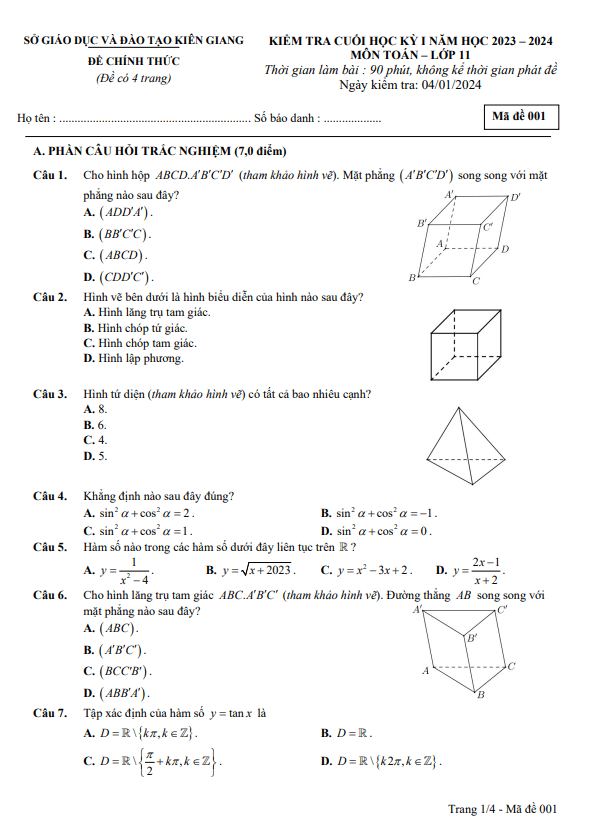 Chào đón quý thầy, cô giáo và các em học sinh lớp 11! Sytu xin giới thiệu đến quý vị đề kiểm tra cuối học kì 1 môn Toán lớp 11 năm học 2023 – 2024 của sở Giáo dục và Đào tạo tỉnh Kiên Giang. Đề thi bao gồm đáp án trắc nghiệm và hướng dẫn chấm điểm tự luận cho các mã đề 001, 002, 003, 004.