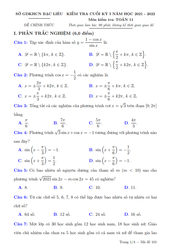 Đề kiểm tra cuối kì 1 Toán lớp 11 năm học 2021 – 2022 sở GDKHCN Bạc Liêu