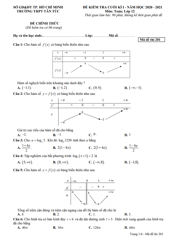 Chào các thầy cô và các em học sinh lớp 12! Đây là đề kiểm tra cuối kì 1 môn Toán lớp 12 năm học 2020-2021 của Trường THPT Tân Túc, TP HCM. Đề thi bao gồm các mã đề 201, 202, 203, 204 kèm theo đáp án.