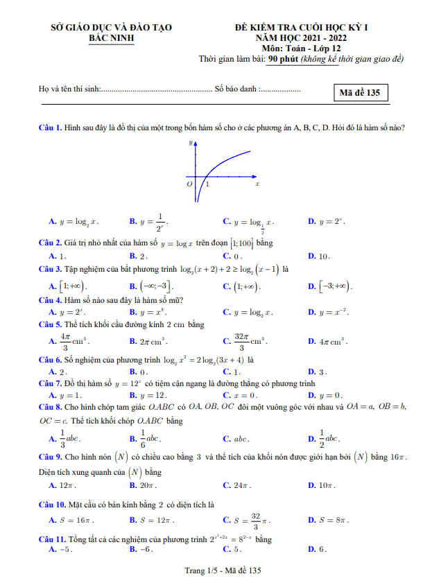 Đề kiểm tra cuối học kỳ 1 (HK1) lớp 12 môn Toán năm 2021-2022 do Sở Giáo dục và Đào tạo Bắc Ninh tổ chức đã diễn ra vào ngày Thứ Năm, 06 tháng 01 năm 2022. Đề thi gồm 50 câu trắc nghiệm trải dài trên 05 trang giấy, với thời gian làm bài là 90 phút (không tính thời gian phát đề).Trong đề thi, học sinh được yêu cầu giải các bài toán phức tạp, đòi hỏi sự tư duy logic và kiến thức vững chắc. Ví dụ như bài toán về mặt cầu S có tâm O và bán kính r, học sinh cần phân biệt được vị trí của một điểm M trong không gian đối với mặt cầu S. Ngoài ra, đề thi cũng đặt ra những bài toán thực tế, như việc tính số tiền mà ông An nhận được sau ba năm khi gửi tiền vào ngân hàng với lãi suất kép. Đây là bài toán cần sự am hiểu về cách tính lãi suất và thời gian gửi tiền.Các bài toán trong đề thi cũng khá đa dạng và đòi hỏi sự linh hoạt trong tư duy của học sinh. Ví dụ, bài toán về khối lăng trụ tam giác ABC và việc tính thể tích khối đa diện H sau khi cắt bỏ khối chóp C ABFE.Tổng thể, đề kiểm tra cuối học kỳ 1 môn Toán lớp 12 năm 2021-2022 tại Bắc Ninh là một bài kiểm tra khá nặng nề, nhưng cũng rất hấp dẫn và thú vị đối với các học sinh yêu thích môn Toán. Đề thi đã thử thách sự hiểu biết, tư duy và khả năng giải quyết vấn đề của học sinh, giúp họ rèn luyện kỹ năng và chuẩn bị tốt cho kỳ thi cuối kỳ sắp tới.