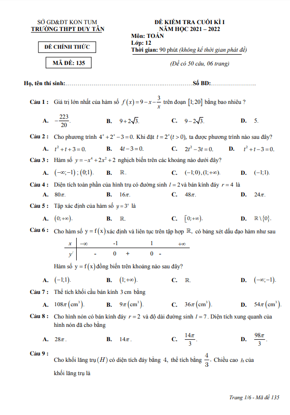 Đề kiểm tra cuối kì 1 môn Toán lớp 12 năm học 2021-2022 của trường THPT Duy Tân Kon Tum đã được Sytu giới thiệu đến quý thầy cô và các em học sinh lớp 12. Đề thi bao gồm các mã đề 135, 136, 137, 138 và có đáp án đi kèm.Trong đề thi, có nhiều câu hỏi đa dạng và phong phú như sau:1. Tính thể tích của khối chóp S ABCD, với đáy là hình vuông và mặt bên SAB là tam giác đều.2. Xác định tập nghiệm của phương trình g(x) = 0 với g(x) được xác định từ đạo hàm cấp 2 của hàm số y = f(x).3. Nhận biết hình nào sau đây không phải là hình đa diện: A. Hình lăng trụ. B. Hình chóp. C. Hình lập phương. D. Hình chữ nhật.Các em học sinh sẽ phải thể hiện kiến thức và kỹ năng của mình để giải quyết các bài toán trong đề thi. Đây chính là cơ hội để thể hiện khả năng và đạt kết quả tốt trong kỳ thi cuối kì này.Đề thi cuối kì 1 môn Toán lớp 12 năm học 2021-2022 chắc chắn sẽ là một thách thức đối với các em, nhưng đồng thời cũng là cơ hội để họ thể hiện sự am hiểu và thành công trong môn học này. Hy vọng rằng các em sẽ đạt kết quả tốt trong kỳ thi sắp tới.