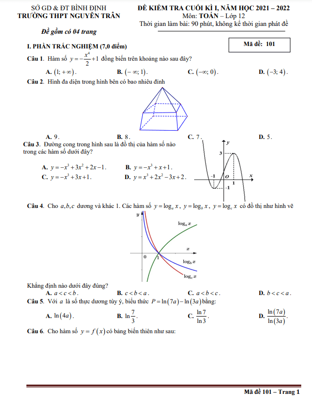 Đề kiểm tra cuối học kì 1 (HK1) lớp 12 môn Toán năm 2021 2022 trường THPT Nguyễn Trân Bình Định