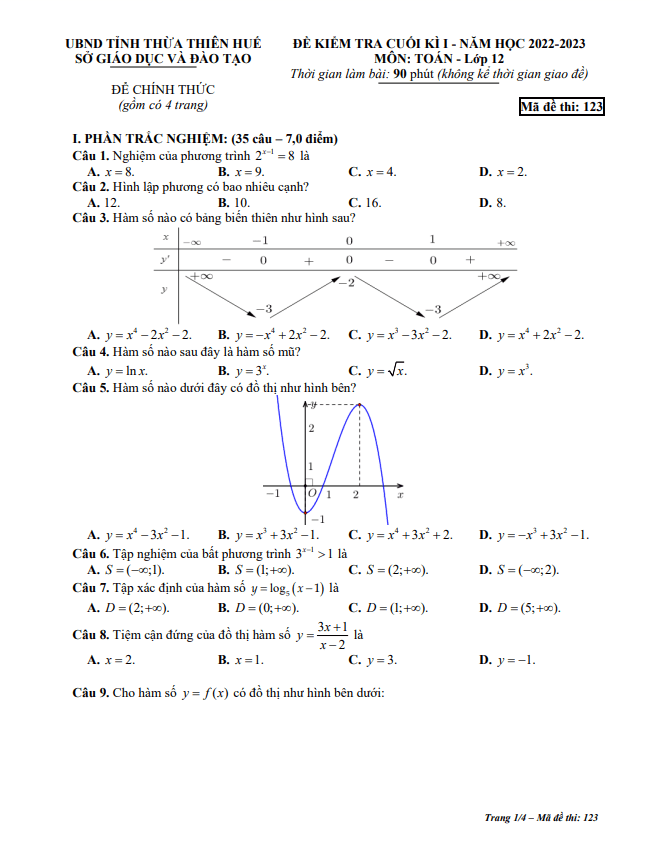 Chào các thầy cô giáo và các em học sinh lớp 12! Bộ đề kiểm tra chất lượng cuối học kì 1 môn Toán lớp 12 năm học 2022-2023 của sở Giáo dục và Đào tạo tỉnh Thừa Thiên Huế đã được biên soạn. Đề thi được thiết kế theo cấu trúc 70% trắc nghiệm và 30% tự luận, bao gồm 35 câu trắc nghiệm và 4 câu tự luận. Thời gian làm bài là 90 phút (không tính thời gian giao đề). Đề thi bao gồm đáp án, lời giải chi tiết và hướng dẫn chấm điểm với mã đề 123, 345, 567, 789.