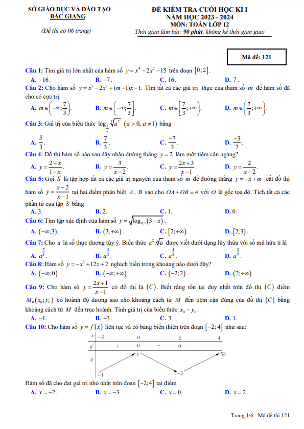 Xin chào quý thầy cô giáo và các em học sinh lớp 12! Hôm nay Sytu xin giới thiệu đến mọi người đề kiểm tra cuối học kì 1 môn Toán lớp 12 năm học 2023 – 2024 của sở Giáo dục và Đào tạo tỉnh Bắc Giang. Kỳ thi sẽ diễn ra vào ngày 28 tháng 12 năm 2023, với đề thi bao gồm mã đề 121, 122, 123, 124 và có đáp án trắc nghiệm.
