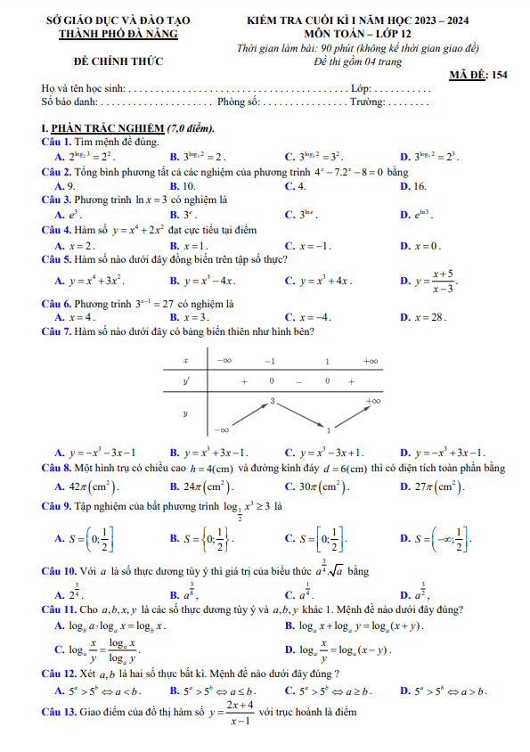 Đề kiểm tra cuối học kì 1 (HK1) lớp 12 môn Toán năm 2023 2024 sở GD ĐT Đà Nẵng