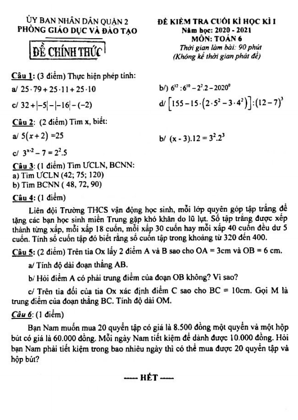 Đề kiểm tra cuối học kì 1 môn Toán lớp 6 năm 2020 – 2021 tại phòng GD&ĐT Quận 2, thành phố Hồ Chí Minh được thiết kế theo dạng tự luận, bao gồm 01 trang với 06 bài toán. Thời gian làm bài thi là 90 phút.