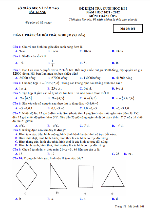 Đề kiểm tra cuối học kì 1 môn Toán lớp 6 năm học 2021-2022 tại sở GD&ĐT Bắc Giang đã diễn ra vào ngày…tháng 12 năm 2021. Kì thi được tổ chức để đánh giá chất lượng học tập của học sinh trong môn Toán. Đề kiểm tra được biên soạn theo hình thức 50% trắc nghiệm và 50% tự luận, gồm tổng cộng 24 câu hỏi. Thời gian làm bài thi là 90 phút.Trong đề kiểm tra, học sinh sẽ phải trả lời các câu hỏi về các kiến thức cơ bản như hình học, phân số, cộng trừ nhân chia, v.v. Ví dụ, một câu hỏi trong đề kiểm tra có thể là: “Hình chữ nhật, hình bình hành, hình thoi là các hình có trục đối xứng?”Ngoài ra, trong đề kiểm tra còn có các bài toán về tính toán và logic. Ví dụ như: “Một sân bóng mini hình chữ nhật có diện tích bao nhiêu mét vuông?”. Hoặc “Nếu sau khi hoàn thành nhiệm vụ, chiếc tàu ngầm nổi lên thêm 82m, thì nó sẽ ở độ cao nào so với mực nước biển?”Kì thi cũng đặt ra các bài toán thực tế như việc tính nhiệt độ theo giờ đối với một địa điểm cụ thể vào ngày mùa đông.Nhằm khuyến khích học sinh có thành tích tốt, giáo viên chủ nhiệm cùng phụ huynh học sinh đã chuẩn bị 120 quyển vở và 72 chiếc bút để trao cho học sinh xuất sắc nhất. Câu hỏi thêm:”Hỏi có thể chia được nhiều nhất bao nhiêu phần thưởng?”để kích thích học sinh tư duy và tính toán.Tổng thể, đề kiểm tra cuối học kì 1 môn Toán lớp 6 năm học 2021-2022 tại sở GD&ĐT Bắc Giang có nhiều bài toán đa dạng, phong phú, giúp học sinh phát triển kỹ năng tư duy logic và khả năng tính toán.