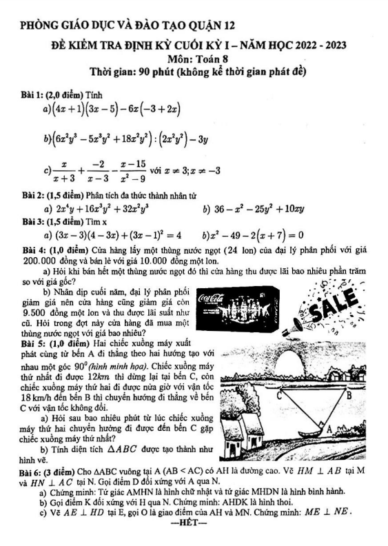 Chào các thầy cô giáo và các em học sinh lớp 8! Sytu xin giới thiệu đến quý vị đề kiểm tra định kỳ cuối học kỳ 1 môn Toán lớp 8 năm học 2022 – 2023 do phòng Giáo dục và Đào tạo Quận 12, TP Hồ Chí Minh biên soạn. Đề thi được thực hiện dưới hình thức tự luận với 6 bài toán, thời gian làm bài là 90 phút.