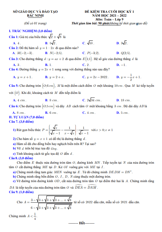 Đề kiểm tra cuối học kỳ 1 Toán lớp 9 năm 2021 – 2022 sở GD&ĐT Bắc Ninh