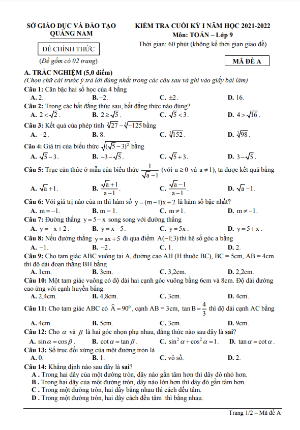 Đề kiểm tra cuối học kì 1 môn Toán lớp 9 năm 2021 – 2022 do Sở Giáo dục và Đào tạo tỉnh Quảng Nam tổ chức đã được công bố. Đề thi bao gồm 15 câu trắc nghiệm và 03 câu tự luận, với tổng số điểm là 10. Thời gian làm bài thi là 60 phút.Một số câu hỏi trong đề thi:1. Khẳng định nào sau đây là sai? A. Trong hai dây của một đường tròn, dây nào gần tâm hơn thì dây đó nhỏ hơn. B. Trong hai dây của một đường tròn, dây nào lớn hơn thì dây đó gần tâm hơn. C. Trong một đường tròn, hai dây bằng nhau thì cách đều tâm. D. Trong một đường tròn, hai dây cách đều tâm thì bằng nhau.2. Cho đường tròn (O) và dây AB khác đường kính. Tính độ dài dây AB khi biết bán kính của đường tròn bằng 10cm và OI = 6cm.3. Chứng minh MB là tiếp tuyến của đường tròn (O) khi đường thẳng Ox vuông góc với dây AB tại I.4. Điều kiện để đường thẳng a và đường tròn (O) cắt nhau là gì khi biết khoảng cách từ tâm O đến đường thẳng a bằng d?Những câu hỏi này sẽ giúp học sinh ôn tập kiến thức và chuẩn bị tốt cho kỳ thi cuối kì. Đề thi có đáp án trắc nghiệm và hướng dẫn giải tự luận để học sinh có thể tự kiểm tra và rút kinh nghiệm sau khi làm bài thi. Chúc các em học sinh thành công trong kỳ thi này!