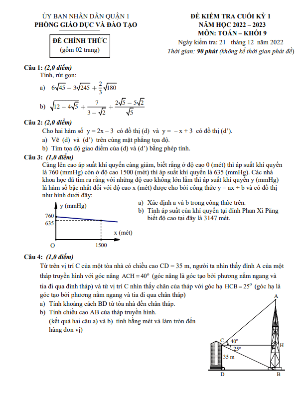 Trích dẫn một số câu hỏi từ Đề kiểm tra cuối kỳ 1 Toán lớp 9 năm 2022 – 2023 của phòng GD&ĐT Quận 1 – TP HCM: