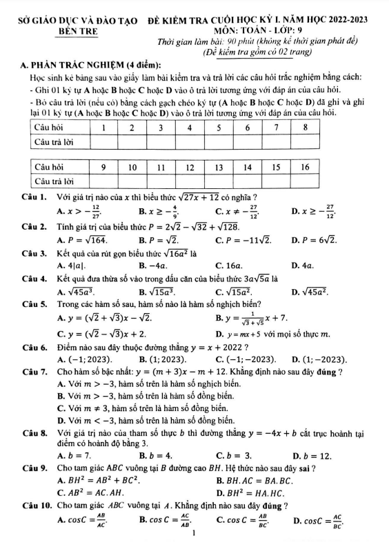 Đề kiểm tra cuối học kì 1 (HK1) lớp 9 môn Toán năm 2022 – 2023 sở GD ĐT Bến Tre