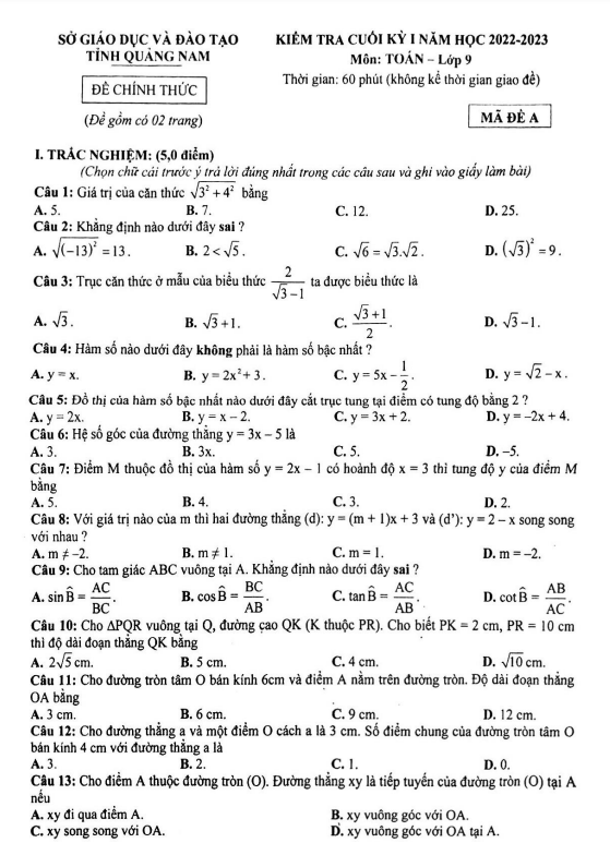 Chào các thầy cô giáo và các em học sinh lớp 9, đề kiểm tra cuối học kì 1 môn Toán lớp 9 năm học 2022-2023 của sở Giáo dục và Đào tạo tỉnh Quảng Nam đã được tổ chức (mã đề A) và đây là một số câu hỏi trong đề thi: