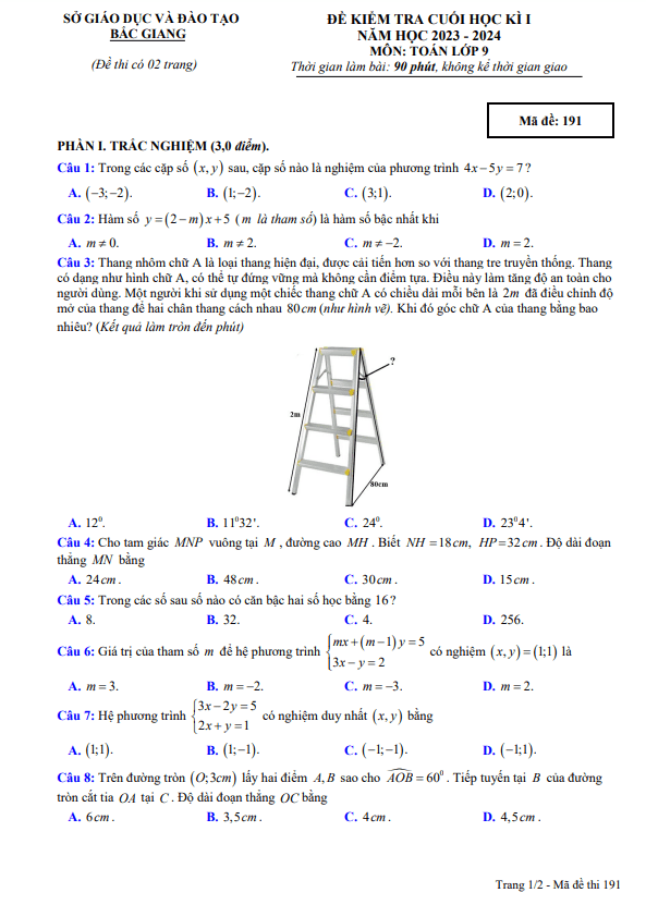 Giới thiệu một cách chi tiết và dễ hiểu đề kiểm tra cuối học kì 1 môn Toán lớp 9 năm học 2023-2024 của sở GD&ĐT Bắc Giang. Đề thi sẽ được tổ chức vào ngày 28 tháng 12 năm 2023 và bao gồm câu hỏi trắc nghiệm và tự luận.Câu hỏi đầu tiên trong đề thi là về thang nhôm chữ A, một loại thang hiện đại và an toàn. Một người sử dụng thang chữ A với chiều dài mỗi bên là 2m và cách nhau 80cm. Sinh viên cần tính góc chữ A của thang trong trường hợp này.Câu hỏi thứ hai là về máy bay khi cách sân bay 280km và bắt đầu hạ cánh. Sinh viên cần tính độ cao của máy bay so với mặt đất khi bắt đầu hạ cánh, biết rằng máy bay tạo góc 0,2 độ với mặt đất khi hạ cánh.Câu hỏi cuối cùng liên quan đến tam giác vuông có đường tròn nội tiếp. Sinh viên cần chứng minh rằng các điểm OADB thuộc một đường tròn và EC là tiếp tuyến của đường tròn.Đề thi được chuẩn bị cẩn thận và mang tính chất thực tiễn cao, giúp học sinh thực hành kiến thức đã học và phát triển kỹ năng giải quyết vấn đề. Chúc các em học sinh lớp 9 đạt kết quả tốt trong kỳ thi này!