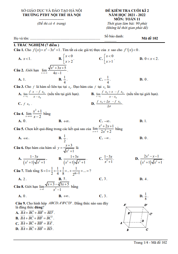 Đề kiểm tra cuối học kì 2 (HK2) lớp 11 môn Toán năm 2021-2022 trường PTDT Nội Trú Hà Nội