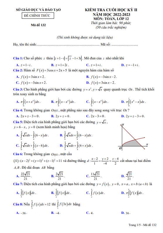 Chào quý thầy, cô giáo và các em học sinh lớp 12! Dưới đây là đề kiểm tra cuối học kỳ 2 môn Toán cho năm học 2022 – 2023 do Sở Giáo dục và Đào tạo tỉnh Bình Dương tổ chức. Đề thi gồm 50 câu hỏi và bài toán, được thi bằng hình thức 100% trắc nghiệm. Thời gian làm bài là 90 phút.