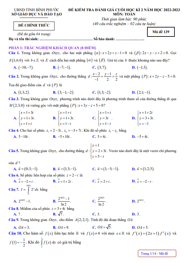 Sytu xin gửi đến quý thầy, cô giáo và các em học sinh lớp 12 đề kiểm tra cuối học kì 2 môn Toán lớp 12 năm học 2022 – 2023 của sở Giáo dục và Đào tạo UBND tỉnh Bình Phước. Đề thi được thiết kế với hình thức 80% trắc nghiệm khách quan + 20% tự luận, thời gian làm bài là 90 phút. Đề thi bao gồm đáp án và hướng dẫn giải chi tiết mã đề 139.